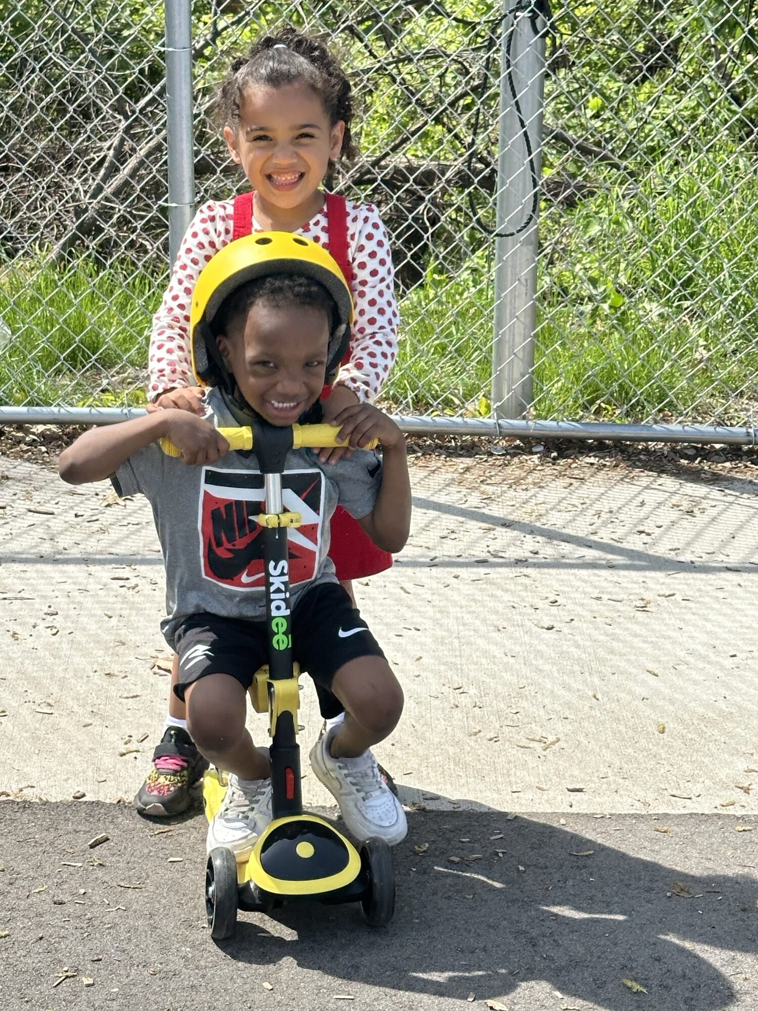 Taking the scooters outside to the playground, the students were thrilled to receive the colorful new equipment. On the playground’s incline, they made predictions and answered questions such as, “Why do you need less force when you go down the hill?” and “How can you go faster or slower?” This practical experience helps solidify their understanding of scientific concepts in a memorable and enjoyable way.
